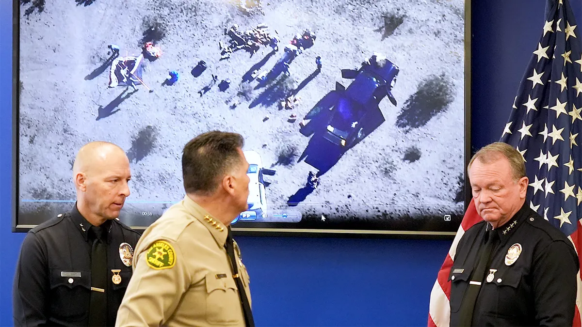 Sheriff Wilayah Los Angeles Robert Luna, tengah, dan Kepala LAPD Jim McDonnell, kanan, menguraikan perkembangan baru dalam penyelidikan terorisme pada 15 Desember 2025, di Los Angeles. (Damian Dovarganes/AP)