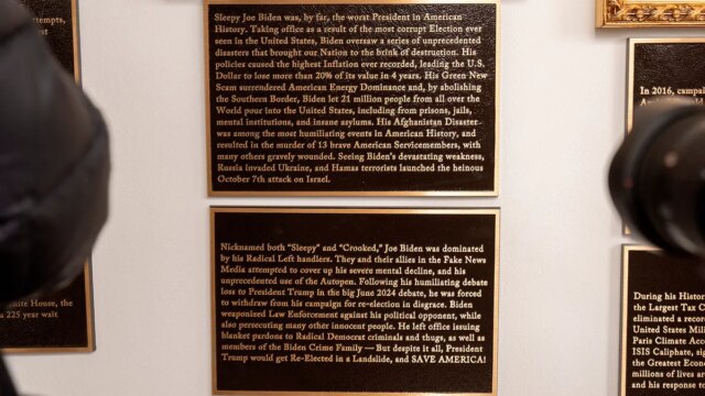 Plakat teks penjelasan baru terlihat di bawah potret berbingkai di ruang mantan Presiden Joe Biden di Presidential Stroll of Fame di Barisan Tiang Gedung Putih, Rabu, 17 Desember 2025, di Washington. (Mark Schiefelbein/Foto AP)