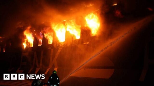 Kebakaran besar terjadi di sebuah kapal feri Turki yang berlabuh di kota pelabuhan Odesa di Ukraina setelah kapal tersebut terkena serangan pada hari Jumat.