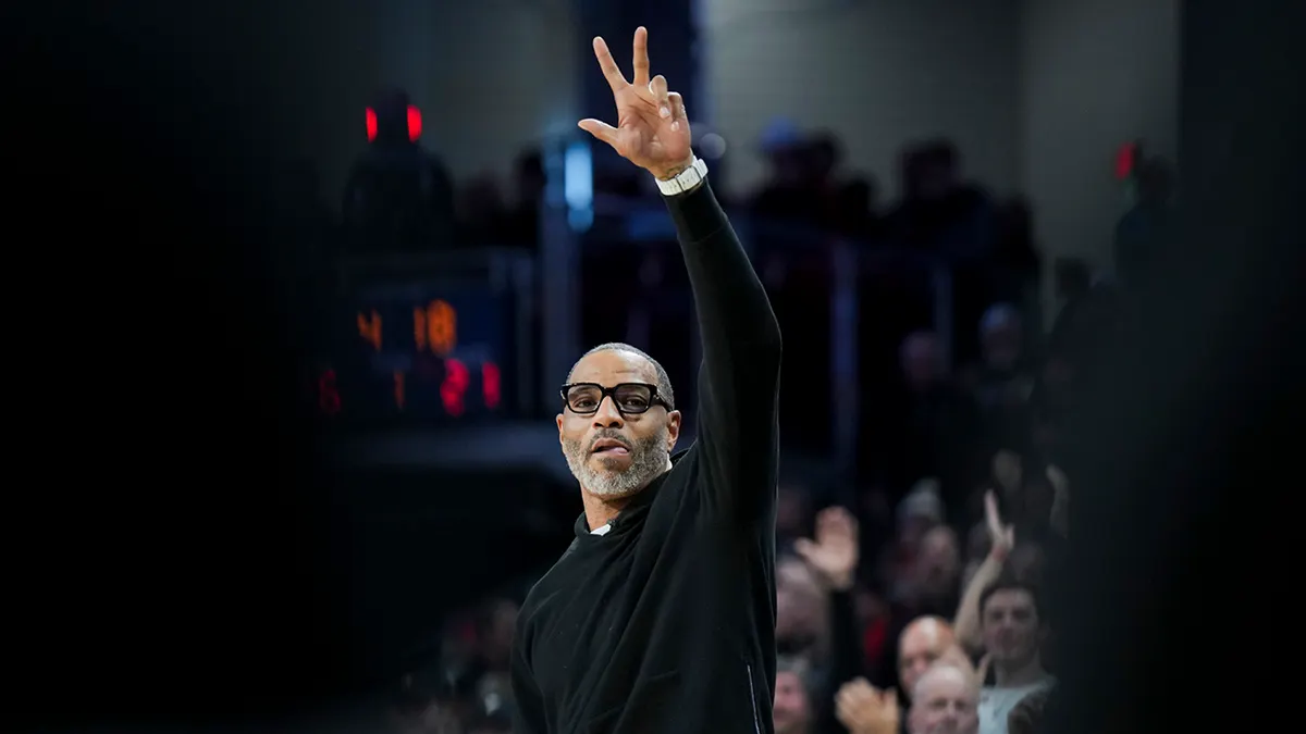 Mantan pemain Bearcat dan NBA Kenyon Martin menyapa penonton saat menghentikan permainan antara Xavier Musketeers dan Cincinnati Bearcats pada babak pertama di Fifth Third Area di Cincinnati 14 Desember 2024. (Aaron Doster/Gambar Gambar)
