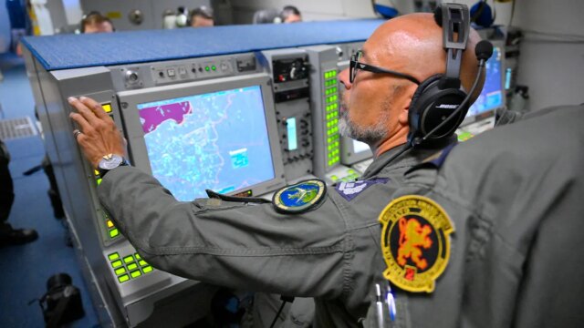 Direktur taktis AWACS NATO menilai situasi udara dan permukaan di atas pesawat Sistem Peringatan dan Kontrol Lintas Udara selama penerbangan di wilayah udara Polandia sebagai bagian dari misi Penjaga Timur aliansi tersebut, 19 September 2025. (John Thys/AFP melalui Getty Photographs)