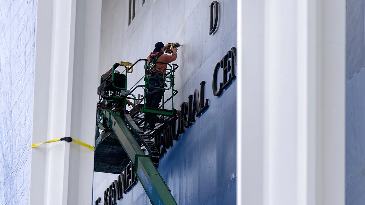 Seorang pekerja mengebor lubang di dekat surat-surat yang dipasang di atas papan tanda di Kennedy Middle pada hari Jumat, 19 Desember 2025, di Washington. (Mark Schiefelbein/Foto AP)