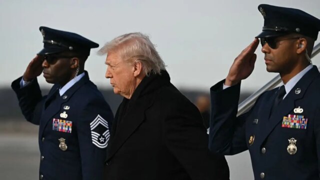 Presiden Donald Trump turun dari Air Pressure One untuk menghadiri pengembalian jenazah dua anggota Garda Nasional Iowa yang tewas dalam serangan di Suriah dalam acara khidmat di Pangkalan Angkatan Udara Dover di Delaware pada 17 Desember 2025. (Foto oleh ANDREW CAALLERO-REYNOLDS / AFP melalui Getty Photographs)
