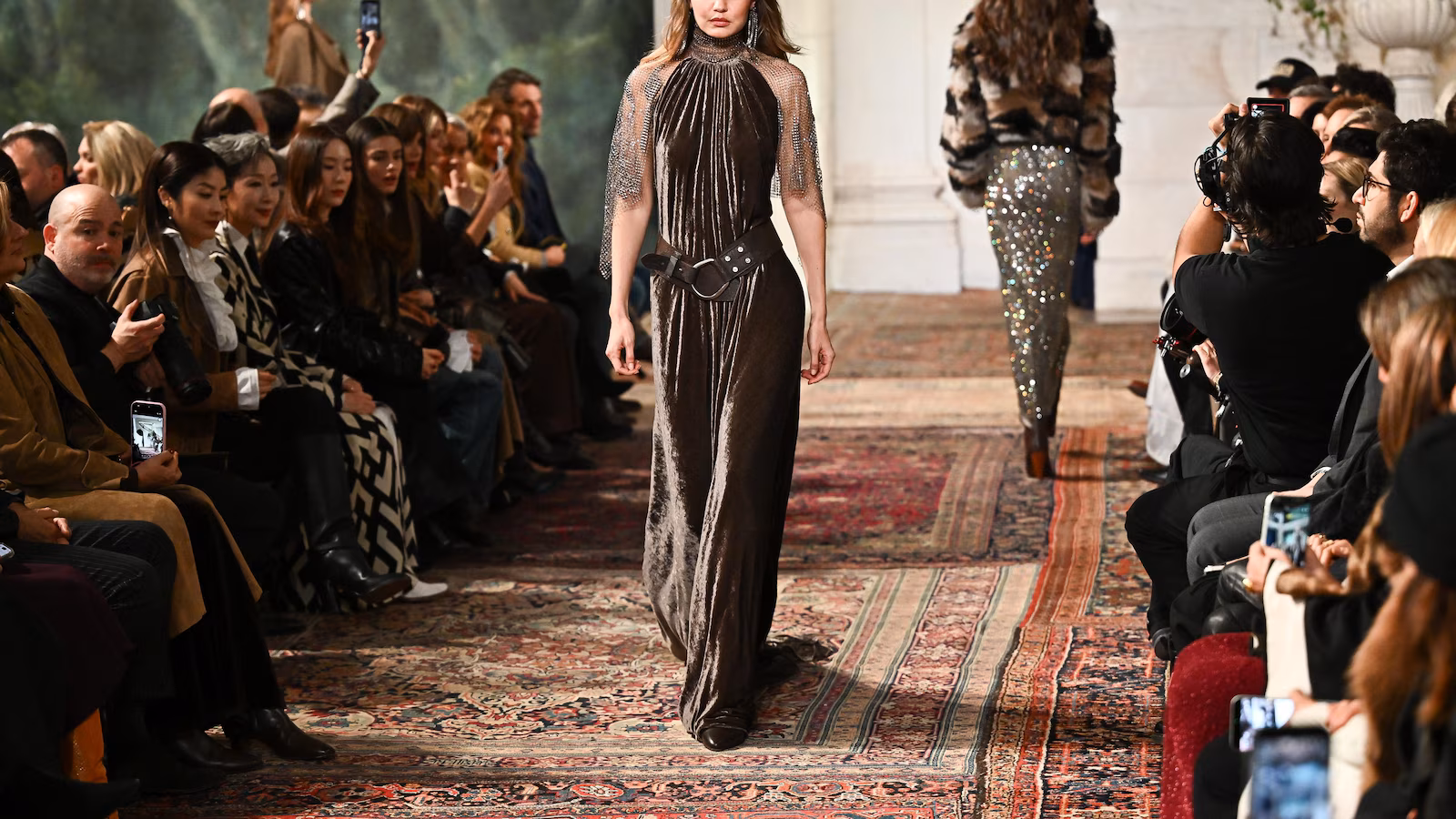 As modelos etéreas de Lauren com seus cabelos esvoaçantes atrás delas desfilavam em tapetes opulentos como convidadas famosas incluindo a atriz Anne Hathaway cantora Lana Del Rey e a atriz Lili Reinhart assistia em cadeiras de estilo antigo; uma tela de paisagem pintada romântica preenchia as paredes que os cercavam.