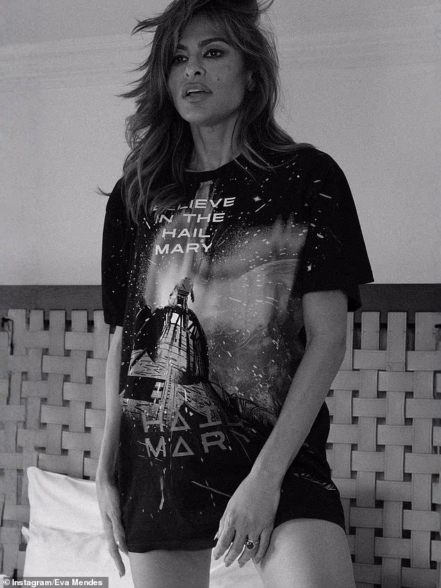 Mendes pode ser vista exibindo pernas compridas enquanto desfilava uma camisa para promover o próximo filme de Gosling, Projeto Hail Mary, que será lançado ainda este ano, em 20 de março.