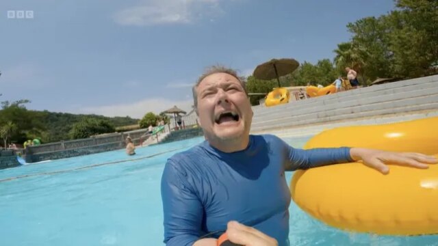O momento hilário aconteceu quando Alan visitou um parque aquático com sua co-apresentadora Amanda Holden enquanto eles reformavam sua última propriedade na Grécia.