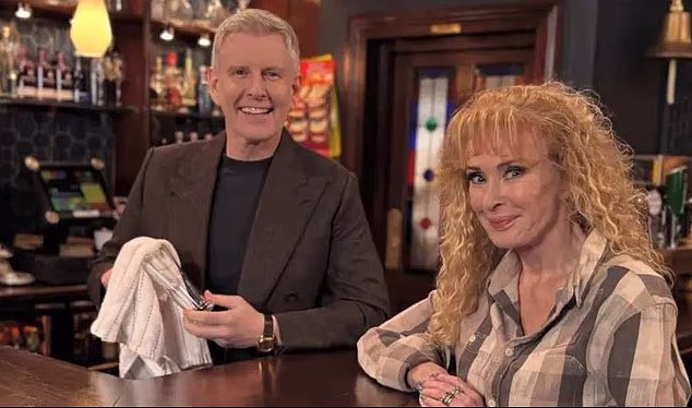 O apresentador do Late Late Present, Patrick Kielty, com Beverley Callard no set em Carrigstown recentemente
