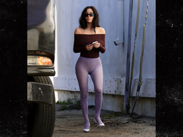 A designer arquitetônica vestiu uma meia-calça lilás que deixava pouco para a imaginação e uma blusa marrom chocolate de ombros largos… finalizando o look de contorno corporal com um par de salto branco.