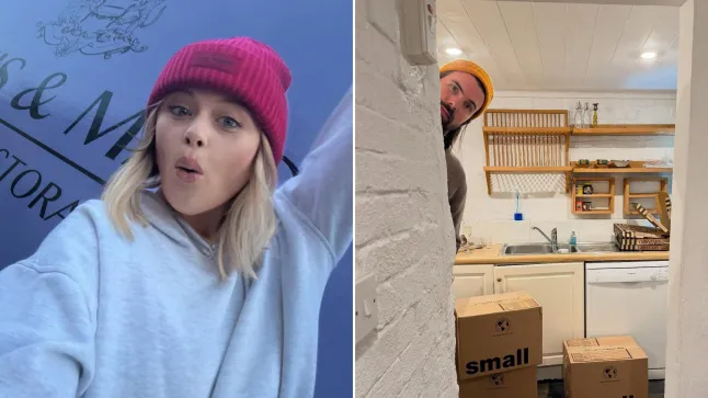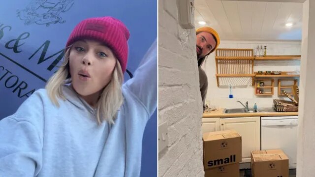 Emily e Alistair comemoraram sua mudança com um copo de espumante e uma entrega de Pizza Categorical antes de começarem a desfazer as malas, já que as caixas estão empilhadas para eles examinarem em cada cômodo.