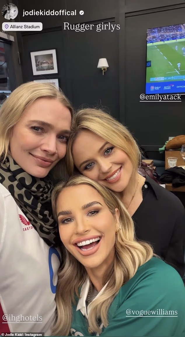 Emily Atack parecia animada ao se juntar à Vogue Williams, seu marido Spencer Matthews e Jodie Kidd no Campeonato das Seis Nações no Estádio de Twickenham no sábado.