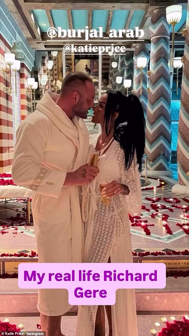 Katie também afirmou que seu ‘equipamento Richard me surpreendeu’, acrescentando ‘manifestar-se funciona’ enquanto ela compartilhava uma foto do Burj Al Arab, com um emoji de um anel.