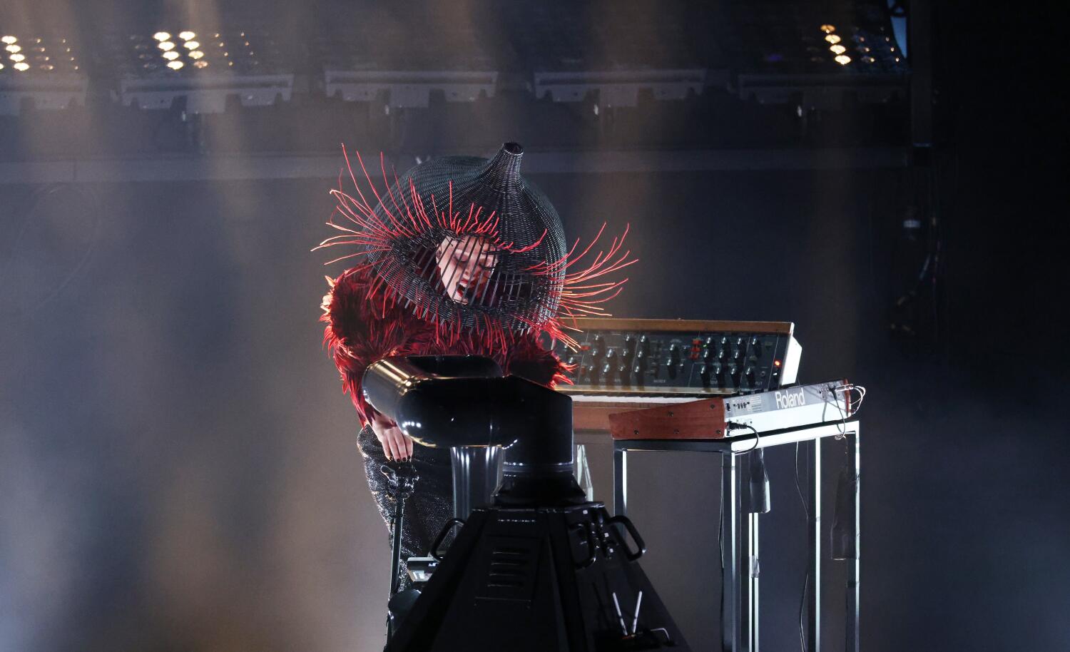 Gaga vestiu um high de manga comprida com penas vermelhas e pretas que terminava em uma saia preta longa, uma cúpula em forma de gaiola escondendo sua cabeça.