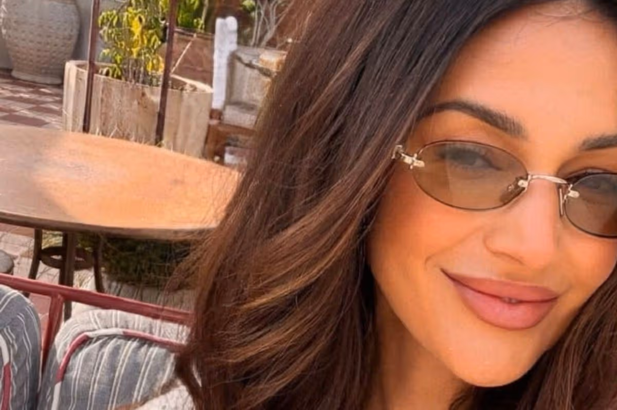 Ela posou para uma selfie ensolarada, na qual podia ser vista vestindo uma camisa branca com uma gola dramática, que ela usava com um par de denims de lavagem clara e complementada com óculos de sol ovais. Sorrindo para a câmera, ela provocou seus milhões de seguidores: “Essa camisetinha fofa está chegando muuuito [eye emojis] – @veryuk.”