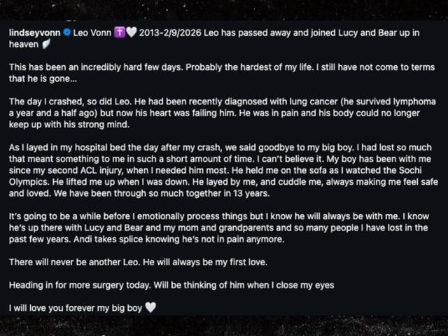 Vonn acrescenta que está confortada em saber que Leo está unido a seus outros dois cães, Lucy e Bear – bem como aos membros da família que ela perdeu recentemente – no céu.