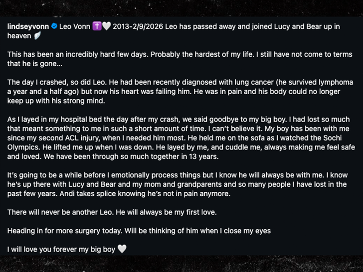 Lindsey VonnEla está lidando com uma tragédia pessoal além de uma tragédia profissional… porque no dia seguinte ao acidente em Milão, encerrando seu sonho olímpico de 2026, seu cachorro morreu.