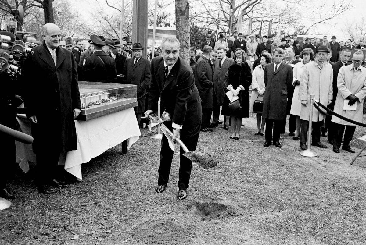 O presidente Lyndon B. Johnson levanta uma pá cheia de terra durante as cerimônias de inauguração do Centro John F. Kennedy de Artes Cênicas em 1964, enquanto membros da família Kennedy observam.
