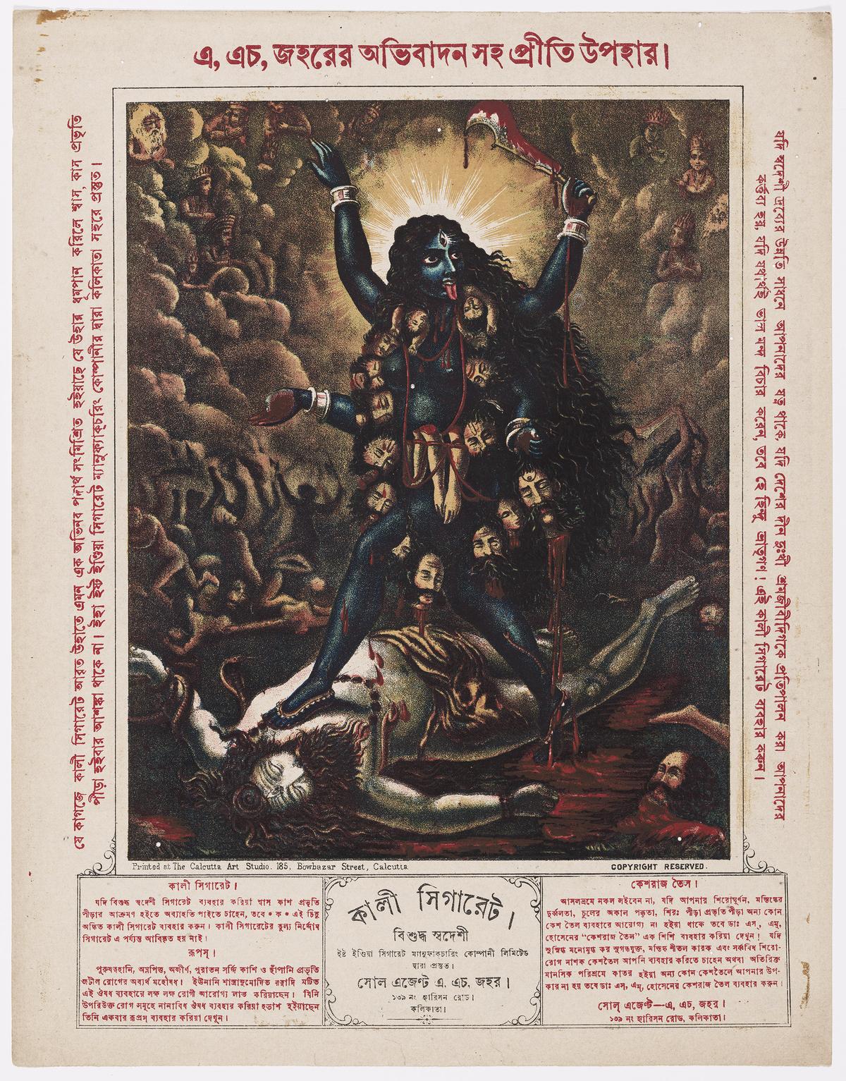 No Museu de Belas Artes de Boston, este pôster vívido de Kali é cercado por carnificina e texto delicadamente renderizado em vermelho sangue. Nas laterais, ele elogia a Deusa como protetora, exortando os devotos a adorarem sua imagem para ter coragem. Abaixo, há um anúncio dos cigarros Kali, orgulhosamente declarados “puro Swadeshi”. (E, no otimismo equivocado típico da época, também “confiável, confiável e seguro para fumar”.)