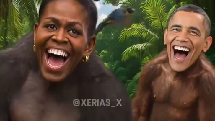 Em seguida, o vídeo corta uma breve cena mostrando as cabeças de Barack e Michelle sobrepostas a macacos dançando na selva enquanto o clássico de 1961 do The Tokens, “The Lion Sleeps Tonight”, toca ao fundo.