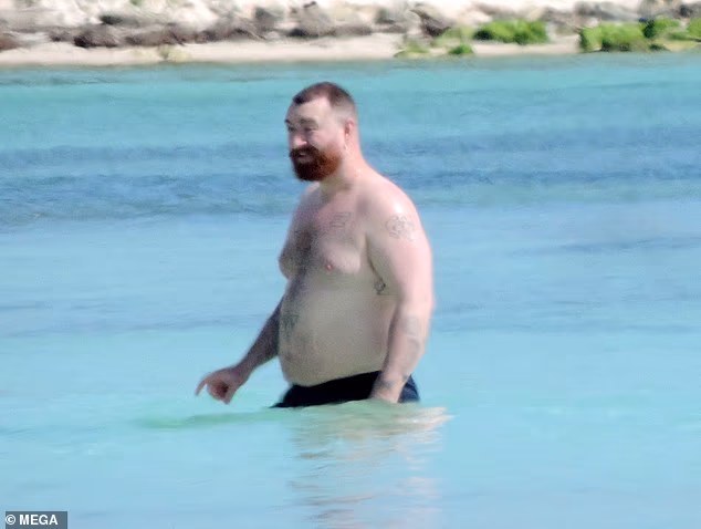 Sam usava shorts de banho Kappa azul marinho, exibindo uma tatuagem de sorvete na perna esquerda antes de dar um mergulho no oceano.