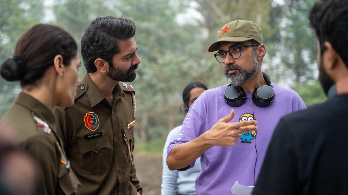 Sudip Sharma conversando com Barun Sobti e Mona Singh nos units da 2ª temporada de ‘Kohrra’ | Crédito da foto: Netflix