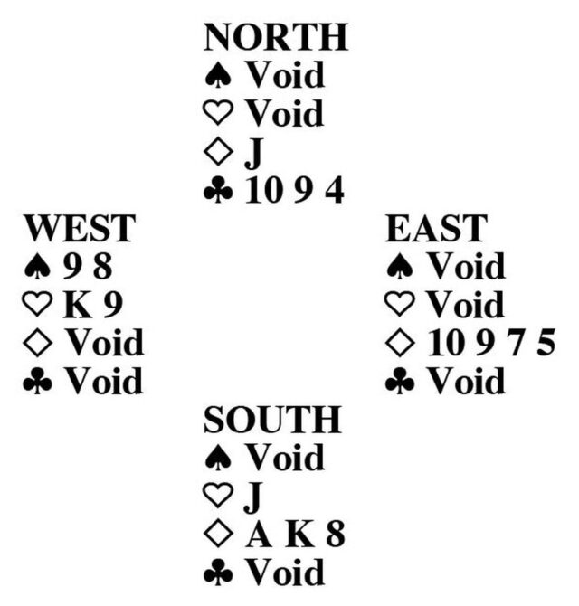 South conquistou a liderança de espadas com o ás do manequim e liderou o rei dos paus. West venceu com o ás e levou outra espada para o rei do morto. South descontou a rainha de ouros, sentindo-se muito bem com as coisas, e ficou doente quando West apareceu. O Sul não desistiu. Ele descontou a dama de paus, descartando uma copa de sua mão, e acertou um taco. Ele descontou sua dama de espadas, descartando uma copa baixa do boneco, depois descontou o ás de copas e acertou uma copa. Esta foi a posição, com a liderança no manequim: