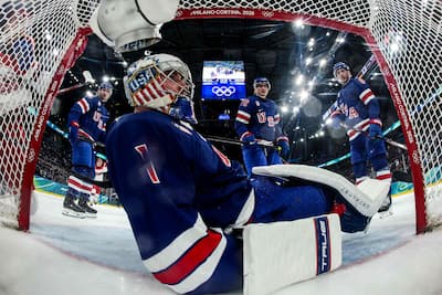 É isso que pode ser explicado, mas de acordo com Jeremy Swayman no centro do patinoire, em 14 de fevereiro, voltado para a Dinamarca.
