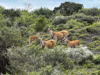 D) L’éland du Cap: Pouvant peser jusqu’à 700 kg, este antílope, dont le macho et la femelle sont équipés de cornes, peut se passer d’eau durante des mois.