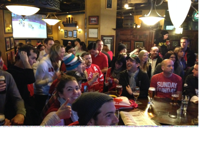 Enquanto esperávamos na fila para entrar, minha esposa saiu da fila para atravessar a rua e sacudir nosso vizinho para acordar enquanto eu mantinha nosso lugar, esperando entre muitos canadenses com ideias semelhantes, vestidos de vermelho e branco, que estavam ansiosos para reivindicar alguns dos bancos altamente cobiçados no bar em forma de V. Todos queriam um lugar na primeira fila para ver o Canadá vencer a Suécia pelo ouro.