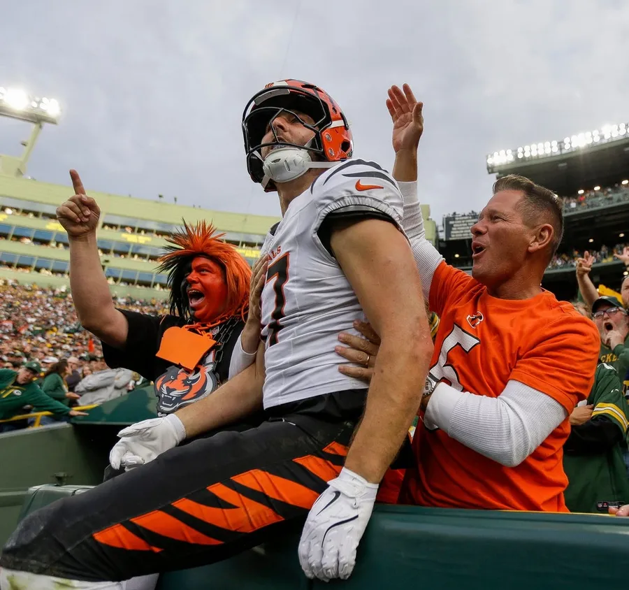 O tight finish do Cincinnati Bengals, Tanner Hudson (87), salta para a arquibancada para comemorar com os fãs depois de marcar um landing contra o Inexperienced Bay Packers no domingo, 12 de outubro de 2025, no Lambeau Area em Inexperienced Bay, Wisconsin. Tork Mason/USA TODAY NETWORK-Wisconsin