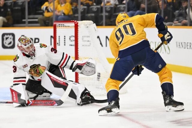 Juuse Saros fez 18 defesas para Nashville, que havia vencido sete de suas últimas 10. Nashville superou Chicago por 9-7 no primeiro período sem gols, com os Blackhawks sendo segurados sem um chute a gol até 5:56 do jogo.