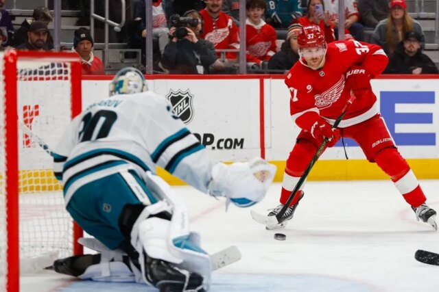 Dylan Larkin marcou o gol verde e Marco Kasper encerrou uma longa seca de gols na vitória do anfitrião Detroit Pink Wings sobre o San Jose Sharks por 4 a 2 na noite de sexta-feira.