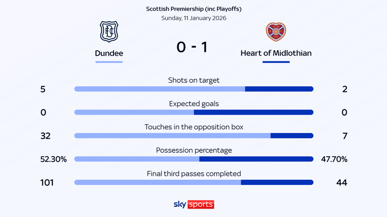 O Hearts marcou no primeiro chute a gol, mas não sem a frustração dos donos da casa. Claudio Braga chutou rasteiro a 20 metros da trave, enquanto Dundee afirmava que a bola estava rolando quando Cammy Devlin cobrou a falta rápida na preparação.