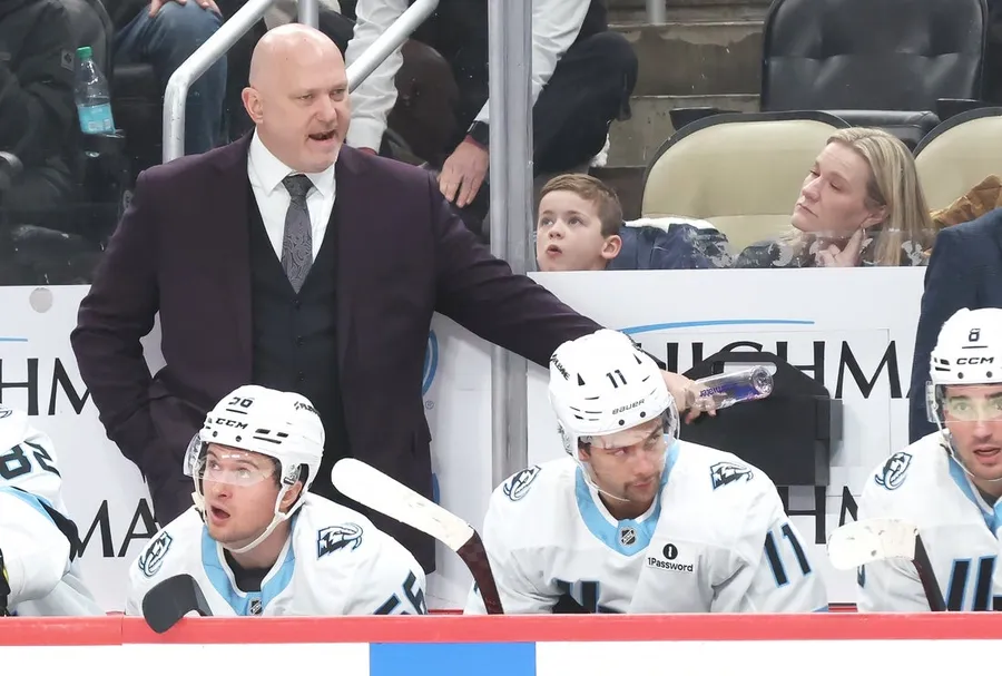 14 de dezembro de 2025; Pittsburgh, Pensilvânia, EUA; O técnico do Utah Mammoth, Andre’ Tourigny (topo), reage no banco contra o Pittsburgh Penguins durante o segundo período na PPG Paints Enviornment. Crédito obrigatório: Charles LeClaire-Imagn Photos