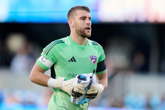 16 de julho de 2025; San José, Califórnia, EUA; O goleiro do FC Dallas, Maarten Paes (1), antes do início do primeiro tempo contra o San Jose Earthquakes, no PayPal Park. Crédito obrigatório: Robert Edwards-Imagn Photos