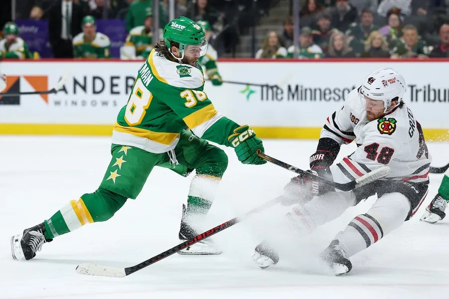 Jared Spurgeon marcou o gol do empate faltando pouco mais de dois minutos para o fim e Kirill Kaprizov marcou o único gol na disputa de pênaltis, levando o Minnesota Wild à vitória por 4 a 3 sobre o Chicago Blackhawks na terça-feira em Saint Paul, Minnesota.