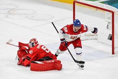 [6:53] Le capitaine tchèque Roman Cervenka se encontrou em boa posição para lanceiro, salvo que son tir dévie no filé protetor.