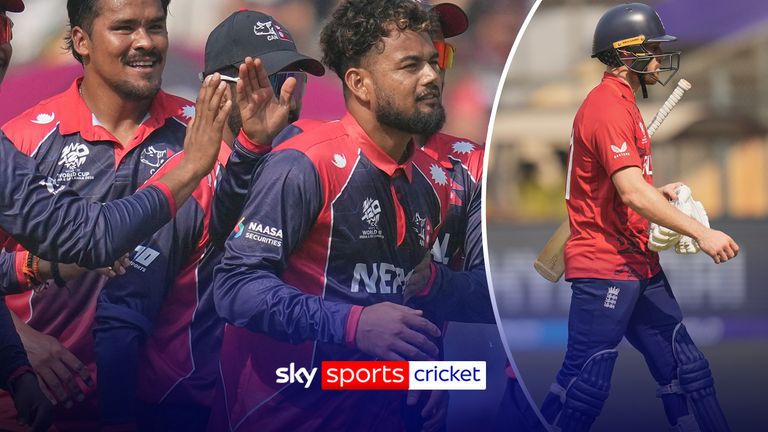 A equipe de Brook, vencedora da Copa do Mundo T20 em 2010 e 2022 e semifinalista na edição anterior em 2024, tropeçou para 57-3 com uma bola no sexto over, quando Tom Banton (2) foi imobilizado lbw na varredura reversa para a primeira entrega do leg-spinner Sandeep Lamichhane.
