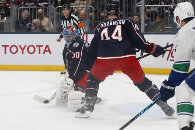 Kirill Marchenko e Kent Johnson marcaram cada um um gol com uma assistência, enquanto Elvis Merzlikins fez 30 defesas na vitória do Columbus Blue Jackets pela terceira vez consecutiva na noite de quinta-feira, por 4 a 1 sobre o visitante Vancouver Canucks, que perdeu nove consecutivas.