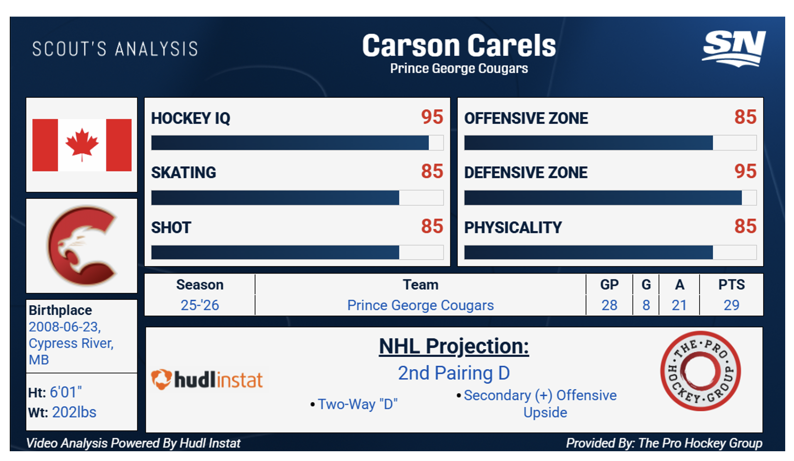Carels disputou quatro partidas pela equipe do Canadá e fez dupla com o também defensor elegível para o draft, Keaton Verhoeff, na rodada de medalhas. O jogador de 1,90 metro e 194 libras se projeta como um defensor da NHL de duas vias e potencial par de topo. Ele patina muito bem e empurra para trás fisicamente.