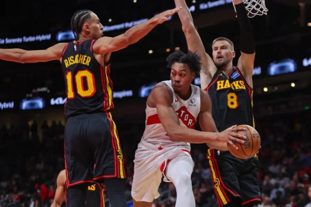 7 de novembro de 2025; Atlanta, Geórgia, EUA; O atacante do Toronto Raptors, Scottie Barnes (4), ultrapassa o atacante do Atlanta Hawks Zaccharie Risacher (10) e o pivô Kristaps Porzingis (8) no quarto período na State Farm Area. Crédito obrigatório: Brett Davis-Imagn Pictures