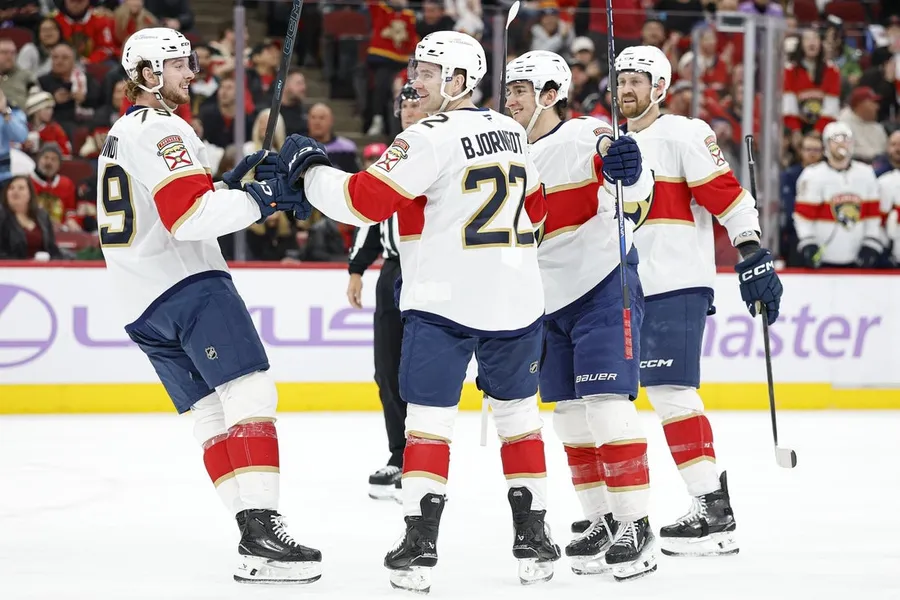 Tobias Bjornfot marcou duas vezes para ajudar o visitante Florida Panthers a vencer o Chicago Blackhawks por 5 a 1 no domingo.