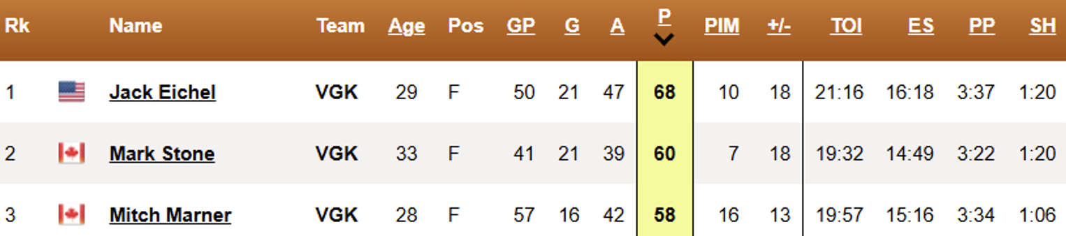 Stone é implantado em todas as situações pelos Vegas Golden Knights. Ele provavelmente estaria liderando a equipe em pontuação se não fosse pelo fato de ter jogado nove partidas a menos que Jack Eichel e ter ultrapassado facilmente Mitch Marner com uma média de 1,46 pontos por jogo.