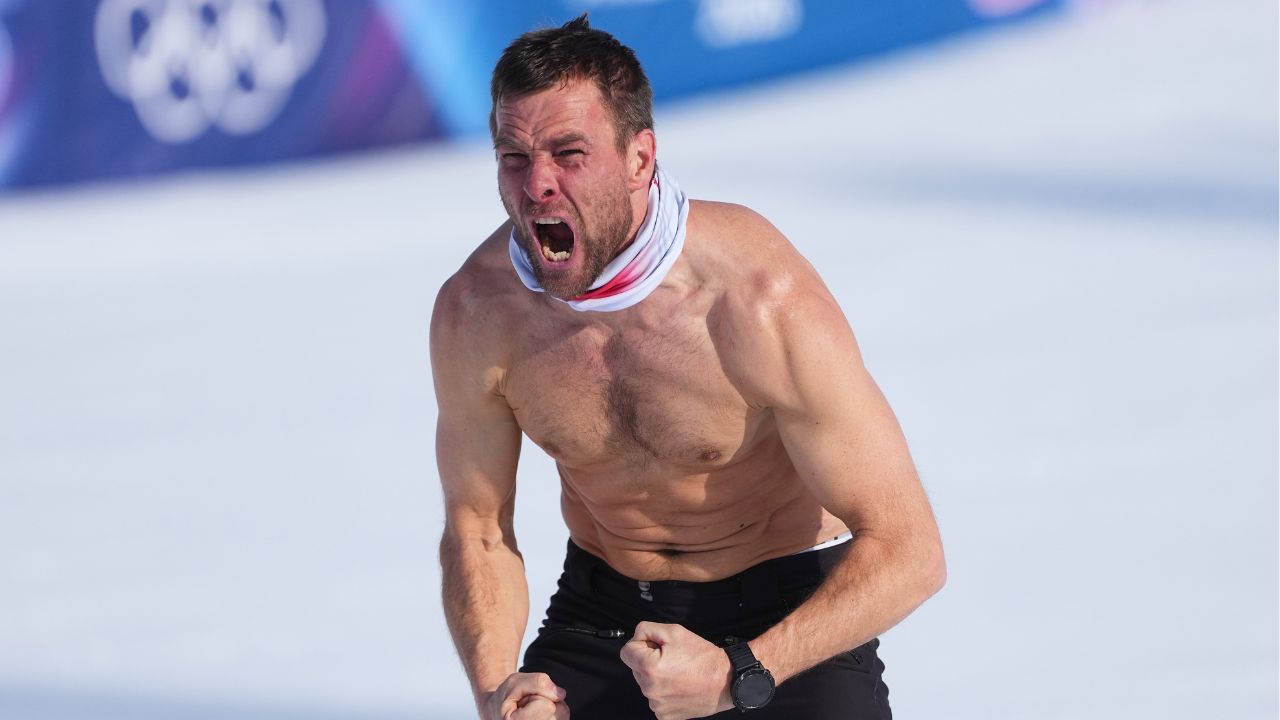 O snowboarder austríaco de 40 anos arrancou a parte superior do uniforme e flexionou-se depois de fazer história no domingo em Milano Cortina 2026.