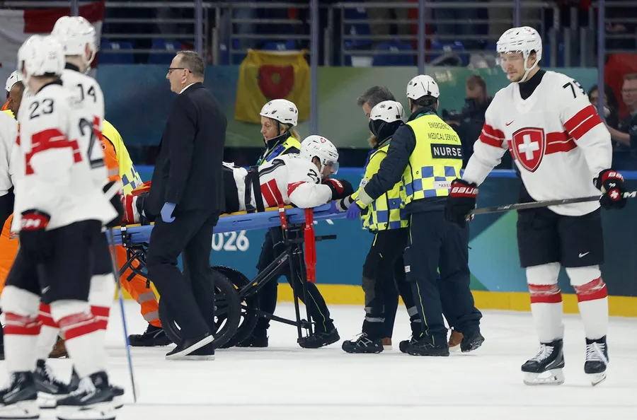 Olimpíadas de Milão Cortina 2026 – Hóquei no Gelo – Rodada Preliminar Masculina – Grupo A – Canadá x Suíça – Milano Santagiulia Ice Hockey Enviornment, Milão, Itália – 13 de fevereiro de 2026. Kevin Fiala, da Suíça, é retirado da maca pela equipe médica após sofrer uma lesão IMAGN IMAGES by way of REUTERS/Geoff Burke