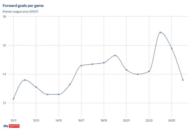 Os números fazem parte de um declínio em toda a Premier League nos gols em jogos abertos. A média caiu significativamente nesta temporada, à medida que um número crescente de equipes dá maior ênfase aos lances de bola parada.
