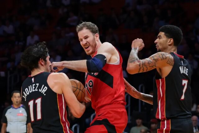 15 de dezembro de 2025; Miami, Flórida, EUA; O atacante do Miami Warmth, Jaime Jaquez Jr. (11), pega um rebote contra o pivô do Toronto Raptors, Jakob Poeltl (19), durante o segundo quarto no Kaseya Heart. Crédito obrigatório: Sam Navarro-Imagn Photographs