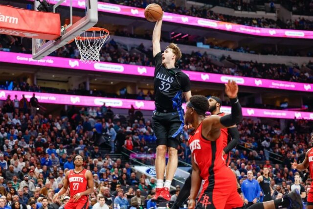 6 de dezembro de 2025; Dallas, Texas, EUA; O atacante do Dallas Mavericks, Cooper Flagg (32), enterrou durante o quarto período contra o Houston Rockets no American Airways Heart. Crédito obrigatório: Andrew Dieb-Imagn Pictures