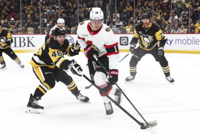 Stutzle aproveitou uma mudança de linha ruim dos Penguins para colocar os Senators à frente por 2 a 1 aos 6:46 do terceiro período. Silovs acertou um chute de Drake Batherson de perto, mas o disco caiu na porta e Stutzle, dando sequência à jogada, acertou com as costas da mão na luva do goleiro.