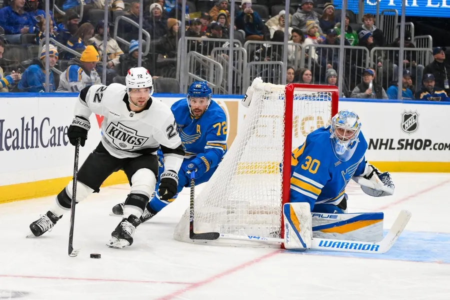 Trevor Moore voltou à ação com um gol e a vitória nos pênaltis na vitória do visitante Los Angeles Kings sobre o St. Louis Blues por 5 a 4 no sábado à noite.