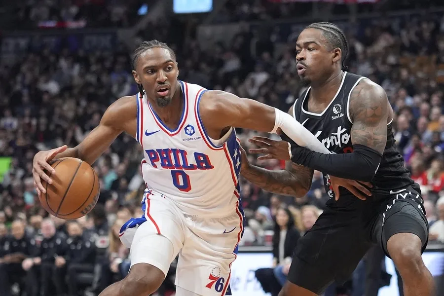Tyrese Maxey marcou 33 pontos na noite de segunda-feira e o visitante Philadelphia 76ers derrotou o Toronto Raptors por 115-102 para ganhar uma divisão do set de dois jogos.